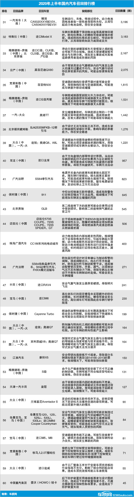 为便于消费者更加清晰的了解上半年国内召回情况,车质网将国家市场监督管理总局公告进行整理,按召回数量由大到小进行排序,最终得出以下排名: