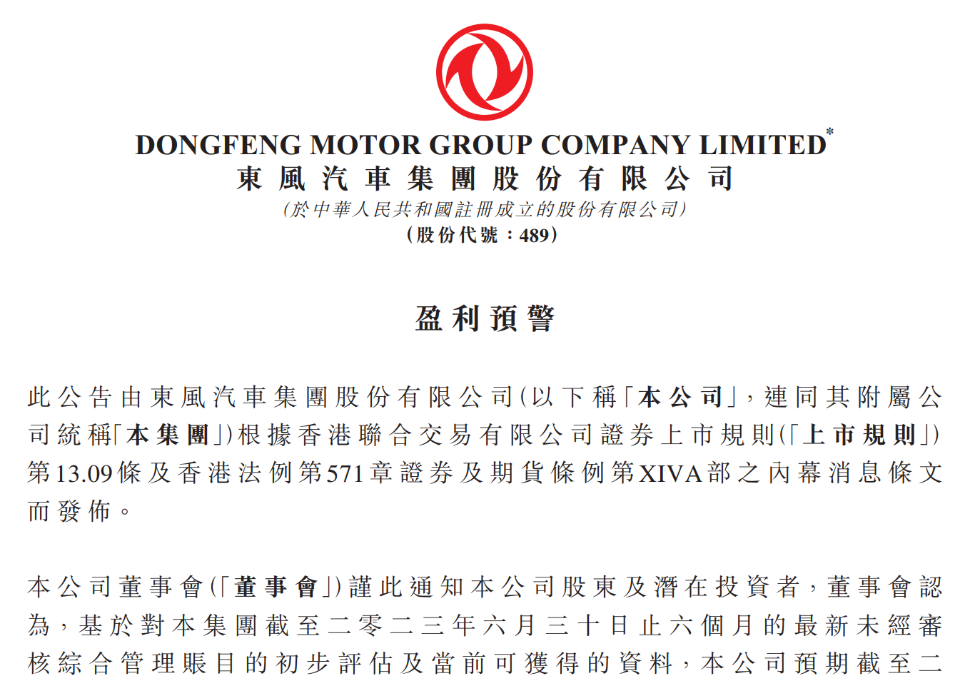 8月14日,东风集团在港交所发布盈利预警公告,预计2023年上半年归母净利润同比下降75%到80%。