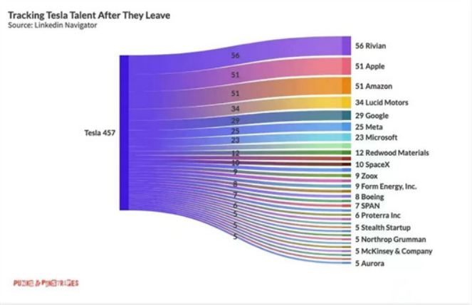 当然,也有大批特斯拉前员工选择了美国的科技巨头,根据Punks & Pinstripes最新统计,有超过100名离职员工加入亚马逊和苹果。