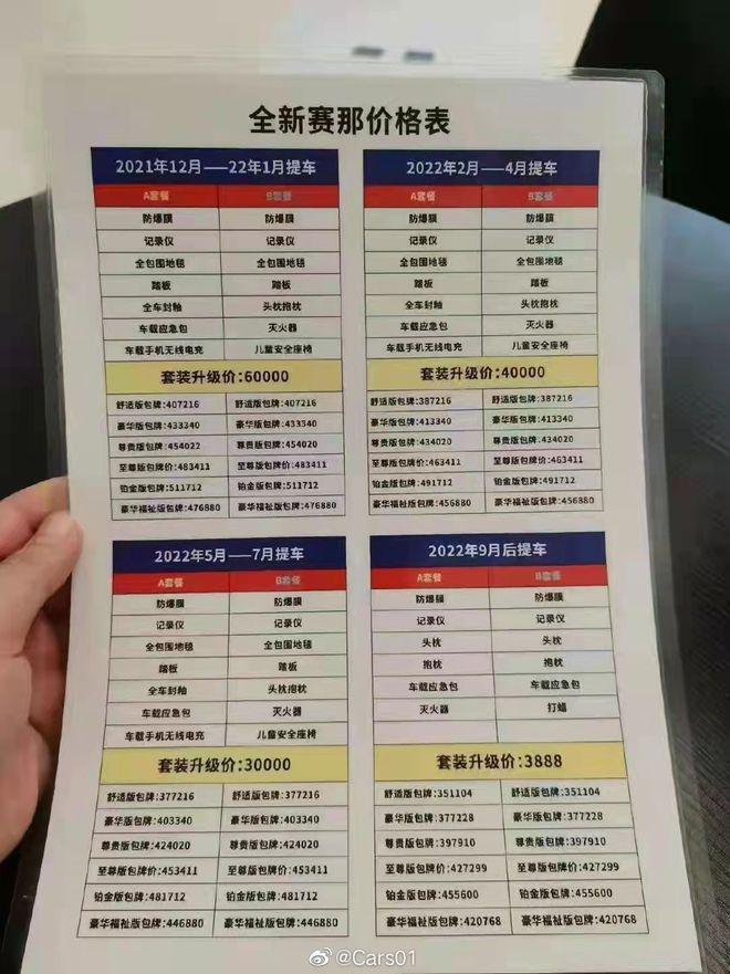 近日,一份全新赛那经销商价格表在网络中曝光,从中我们看到店内提供四款升级套装,选择价格更高的升级套装可以尽快提车。具体来看,最低档加价3888元,包括贴膜、记录仪、头枕、抱枕等项目,提车时间在2022年9月后,需注意的是商家并没有确定在9月份当月可以提车;第二档加价30000元可在2022年5月-7月之间提车,在3888元档基础增加了全车地毯、脚踏板和手机无线充电、儿童安全座椅等;第三档加价40000元可在2022年2月-4月提车,套装内容与第二档相同。第四档加价60000元可在2021年12月-2022年1月提车。全新赛那这种不接受官方建议指导价的行为,各位网友怎么看?