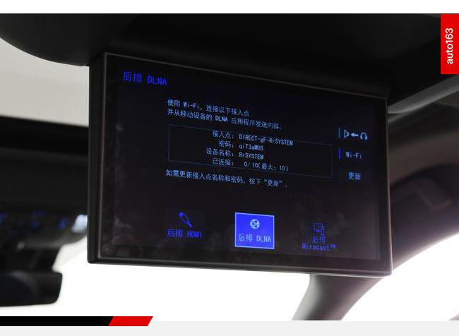 第二排车顶上提供了一个隐藏式的液晶显示屏,支持通过WIFI或者有源来播放视频。这在全家人出行的话,孩子再也不会因为太无聊在车里吵闹了。