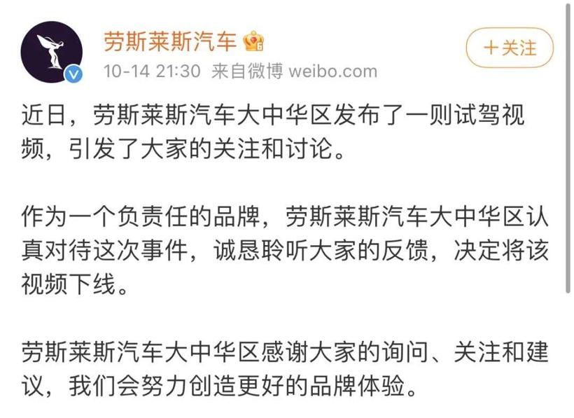 随着该事件的发酵,劳斯莱斯不得不向网友致歉,并下架该视频。