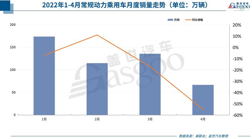 据乘联会数据,今年1-4月我国累计乘用车传统燃油车的销量为492万辆,较去年同期累计增速下滑18%,其中4月传统狭义乘用车销量为67万辆,较去年同期下降55%,环比上月下降50%,下降幅度巨大。