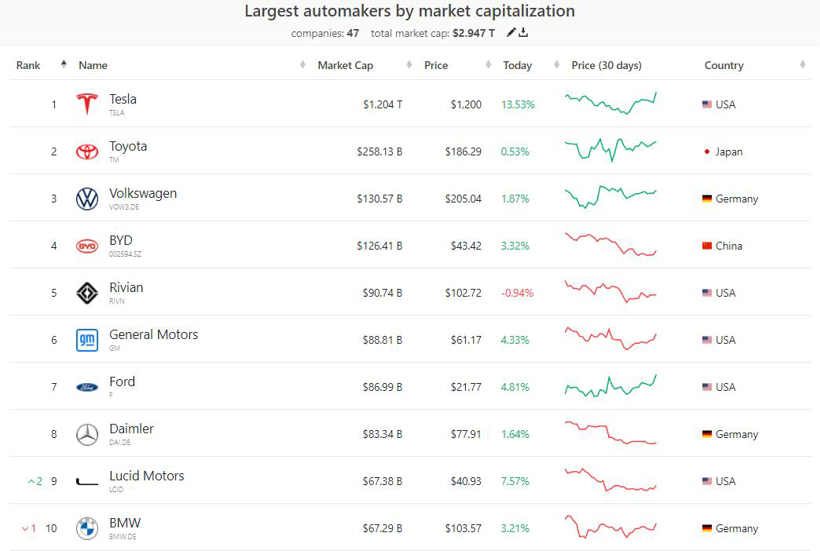 2021年,特斯拉的股价飙升近50%,市值超过1万亿美元,成为少数几家达到这一水平的美国上市公司之一。