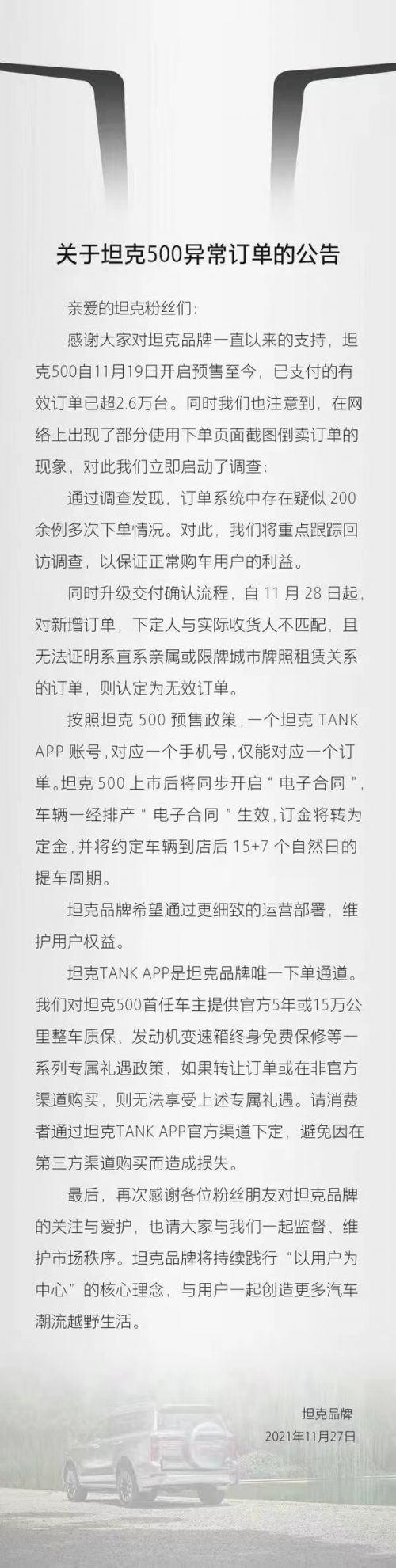 11月27日,从官方获悉,长城坦克发布公告,坦克500自开启预售至今,深受黄牛恶意抢订,扰乱正常秩序的困扰。本着对用户负责的态度,制定了专项应对措施并发布了异常订单公告。