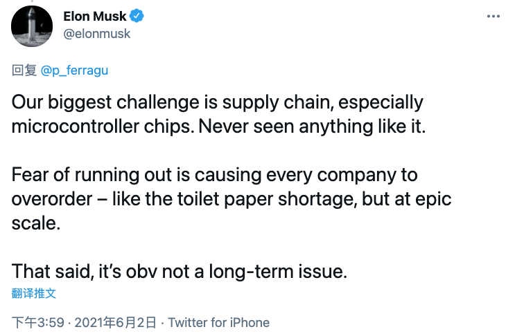 随后马斯克回复称:“我们最大的挑战来自供应链,尤其是微控制器芯片。从来没有见过这样的情况。对供应不足的担心导致每一家公司都在过量下订单,就像此前出现的卫生纸短缺一样,只不过规模更大。但是尽管如此,很明显这不会是一个长期问题。”