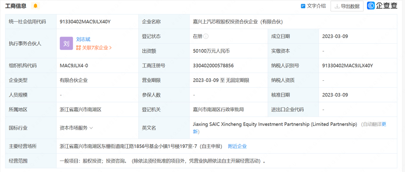 3月13日消息,据企查查显示,嘉兴上汽芯程股权投资合伙企业(有限合伙)于近日成立,注册资本5.01亿元。该企业由上海汽车工业(集团)有限公司、上海上汽恒旭投资管理有限公司共同出资。