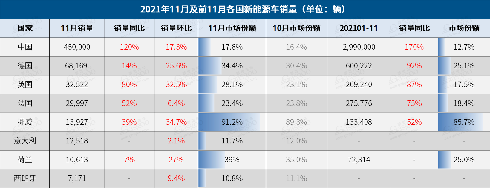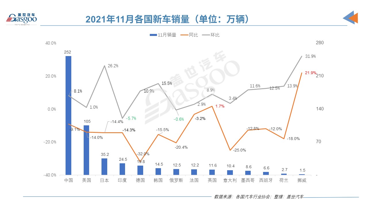 11月,全球电动车市场产销趋势仍与整体车市相反,各国电动车销量同环比均呈增长,且增幅较上一个月有所回升。