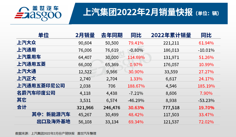 日前,上汽集团公布了2022年2月产销快报。数据显示,其2月整车销量为32.2万辆,同比增长30.6%,其中,新能源和海外销量分别增长48.42%和69.34%,表现仍然强劲。