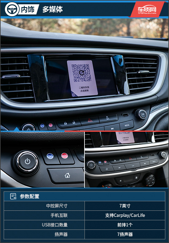 由于试驾车并未激活车载系统,因此未能进行体验和测试。根据官方公布的配置信息来看,新车搭载7英寸中控屏,内置eConnnect智能互联系统,带有高德导航及酷我音乐等多种应用,支持苹果CarPlay以及百度CarLife手机互联。此外,标志性的安吉星功能也非常实用。通过以往测试过的别克车型来看,eConnnect智能互联系统的交互逻辑以及流畅度都无须担心,再配合车联网以及OTA在线升级的功能加持,完全能够满足日常使用。