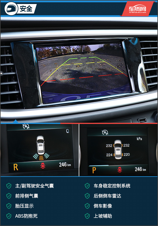 安全配置方面,英朗的表现中规中矩。虽然缺少主动安全系统,但被动安全配置还算丰富,带有前排侧气囊以及胎压显示功能。除此之外,其配备的后侧驻车雷达、倒车影像以及上坡辅助功能,也基本能够覆盖大部分的使用场景。雷达图可以显示在仪表盘中部的液晶屏上,随着距离的远近,提示线的颜色也会发生变化,非常直观。倒车影像画面清晰,边角的畸变情况也并不严重,此外还配有辅助线,实用性表现尚可。
