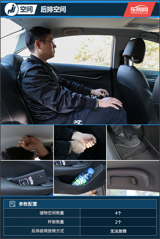 保持前排座椅位置不变,体验者来到第二排,坐好后头部同样有一拳左右的富裕,腿部则大约还有两拳余量,正常乘坐时并不会感到拥挤和压抑。虽然乘坐空间表现尚可,但是后排储物空间却着实显得有些捉襟见肘,除门板储物槽外,就只剩下车顶扶手上的挂钩。