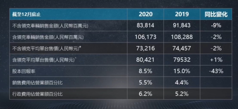 另外,截至去年12月底,吉利汽车不含领克平均单车售价为7.3万元人民币,含领克平均单台售价为8万元人民币。2020年吉利汽车的股本回报率为8.5%,销售费用和行政费用占营业额的百分比分别为5.5%和6.2%,与去年同期相比均有所增加。吉利汽车方面表示,销售费用和行政费用的增加,主要在于新车型推出增加了营销费用,同时也加大了对研发的投入。2020年,吉利汽车投入48亿研发费用,占总收入的5.2%。